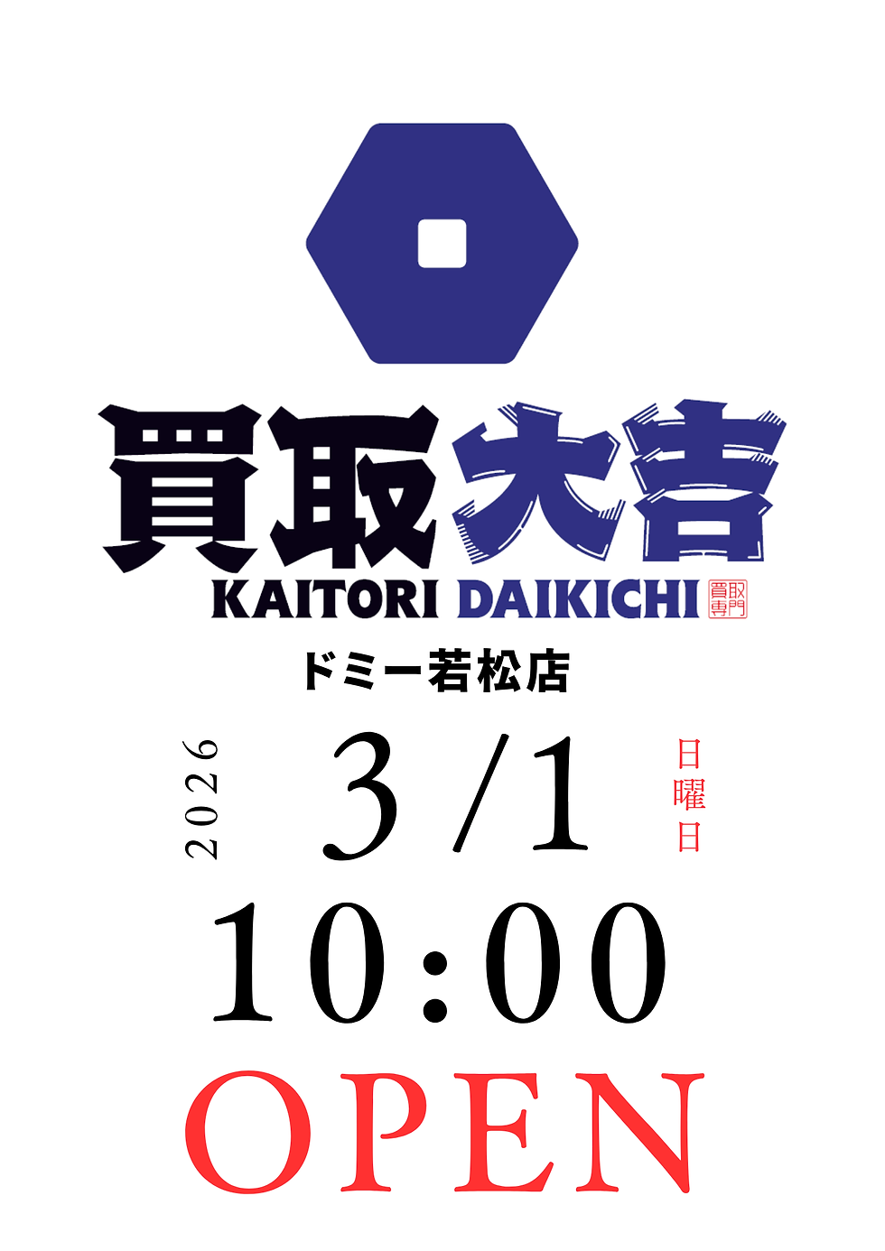 明日、3月1日(日) 買取大吉ドミー若松店が新規OPENいたします。